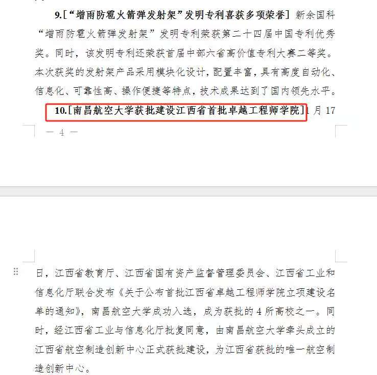 2024年1月17日,省教育厅、省国有资产监督管理委员会、省工业和信息化厅联合发布了《关于公布首批江西省卓越工程师学院立项建设名单的通知》。我校凭借在航空领域的卓越贡献和深厚底蕴,成功入选该名单,成为获批的4所高校之一。这一荣誉不仅是对我校在工程师教育培养方面的高度认可,也彰显了学校在江西省国防科技工业中的重要地位。与此同时,经省工业和信息化厅批复同意,由我校牵头成立的江西省航空制造创新中心也正式获批建设。该创新中心将成为江西省在航空制造领域的核心研发机构,致力于推动航空制造技术的创新和突破,为江西省乃至全国的航空工业发展贡献力量。