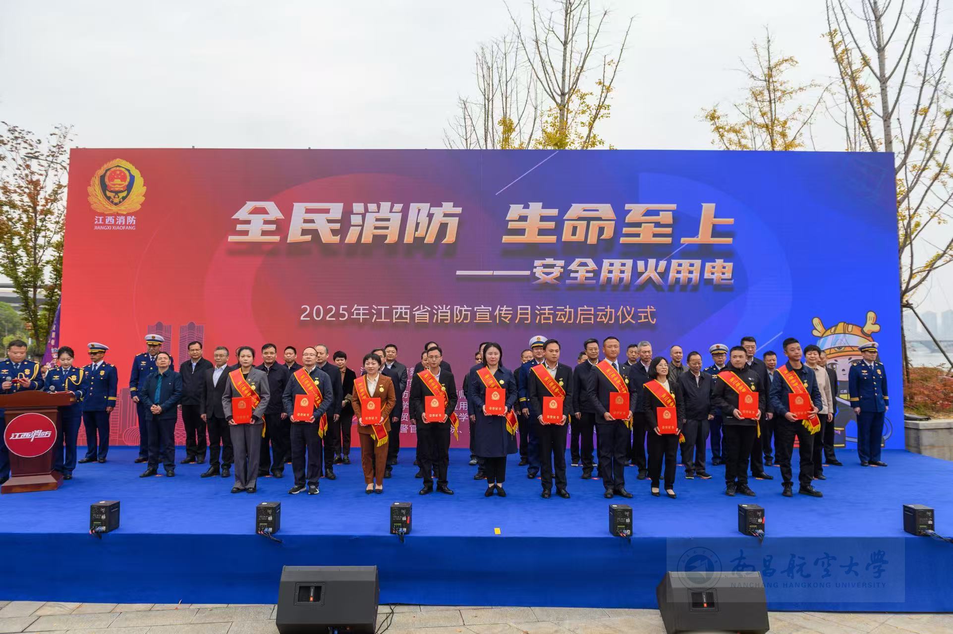 启航网讯 11月4日,江西省“消防宣传月”活动启动仪式在南昌市水天消防广场举行。省政府副秘书长邓永翔、省消防救援总队总队长王献忠等领导出席活动。仪式现场,为江西省第二届119消防先进集体、先进个人颁发证书与奖杯。我校保卫处消防科科长谢宜洋获“全省119消防先进个人”称号。