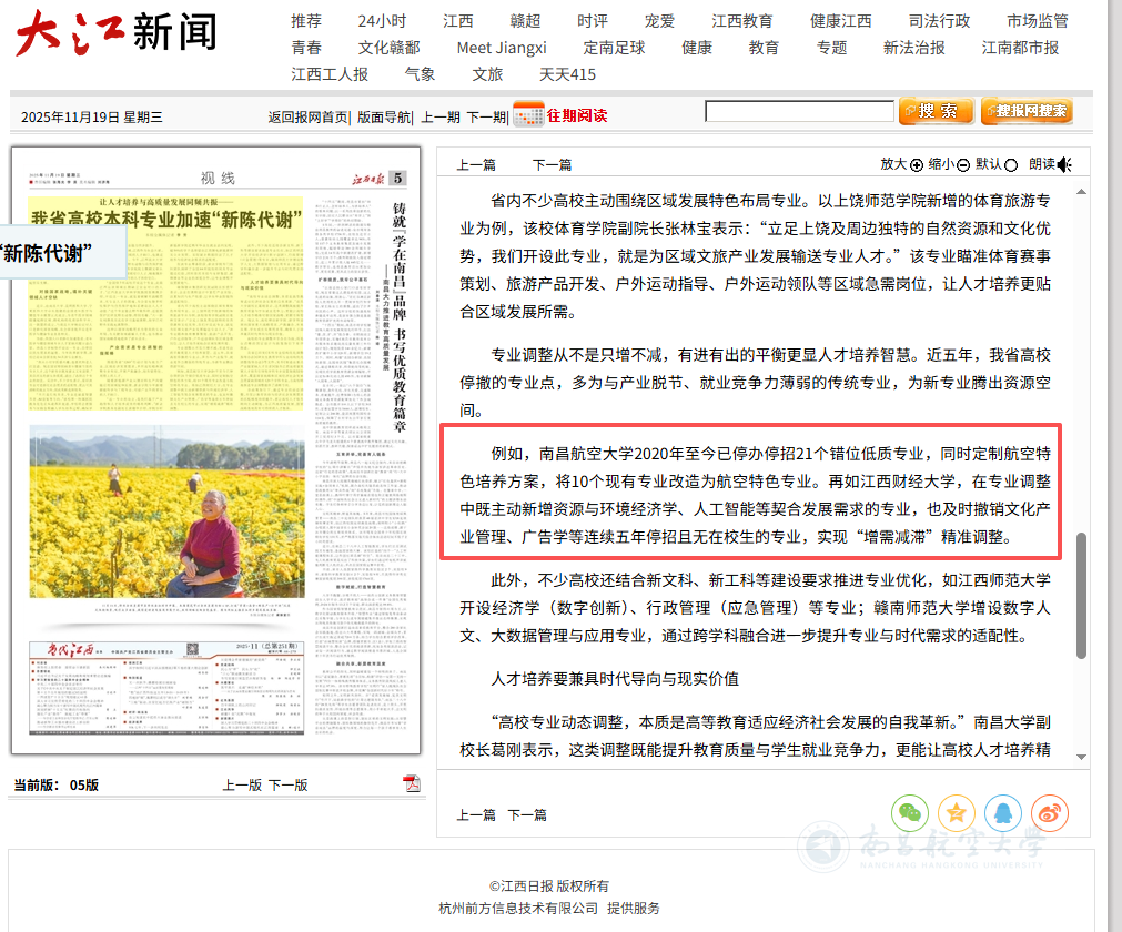 您的位置: 首页 >新闻中心>媒体南航>详细内容 媒体南航 【江西日报】让人才培养与高质量发展同频共振—— 我省高校本科专业加速“新陈代谢” 来源: 作者: 摄影: 发布时间:2025-11-20 浏览次数: 次 【字体:小 大】 启航网讯 江西日报05 视线在《让人才培养与高质量发展同频共振—— 我省高校本科专业加速“新陈代谢”》一文中报道我校。 媒体链接:江西日报数字报-我省高校本科专业加速“新陈代谢” 责任编辑:李梦遥 相关内容 【打印正文】