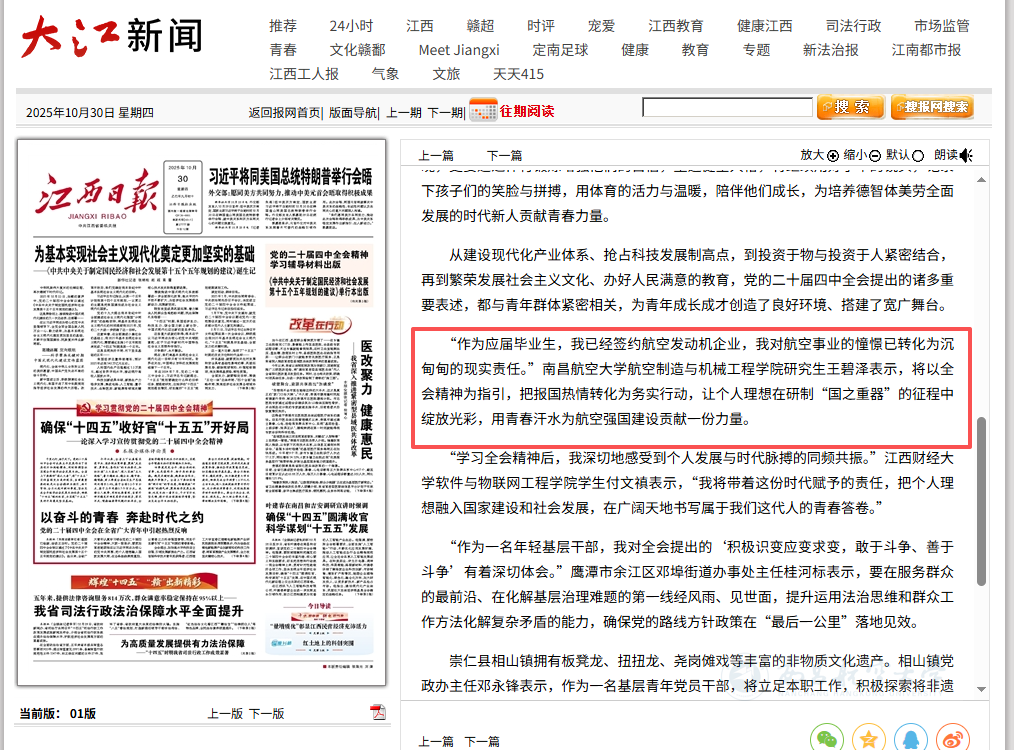 您的位置: 首页 >新闻中心>媒体南航>详细内容 媒体南航 【江西日报】以奋斗的青春 奔赴时代之约 党的二十届四中全会在全省广大青年中引起热烈反响 来源: 作者: 摄影: 发布时间:2025-10-31 浏览次数: 次 【字体:小 大】 启航网讯 江西日报01版在《以奋斗的青春 奔赴时代之约 党的二十届四中全会在全省广大青年中引起热烈反响》中报道我校。 媒体链接:江西日报数字报-以奋斗的青春 奔赴时代之约 责任编辑:李梦遥 相关内容 【打印正文】