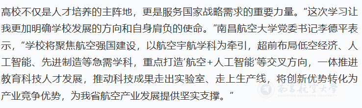 高校不仅是人才培养的主阵地,更是服务国家战略需求的重要力量。“这次学习让我更加明确学校发展的方向和自身肩负的使命。”南昌航空大学党委书记李德平表示,“学校将聚焦航空强国建设,以航空宇航学科为牵引,超前布局低空经济、人工智能、先进制造等急需学科,重点打造‘航空+人工智能’等交叉方向,一体推进教育科技人才发展,推动科技成果走出实验室、走上生产线,将创新优势转化为产业竞争优势,为我省航空产业发展提供坚实支撑。”
